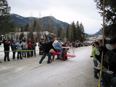 The races began and so did the fun. Revelers cheered and so did we as sleds went by, sometimes a bit too close forcing us to jump out of harms way. And jumping we did when the Sasquatch and the fur trappers canoe came plunging into the crowd and knocking over Mallory. No one was injured, thank goodness, and Mallory caught it all on video.