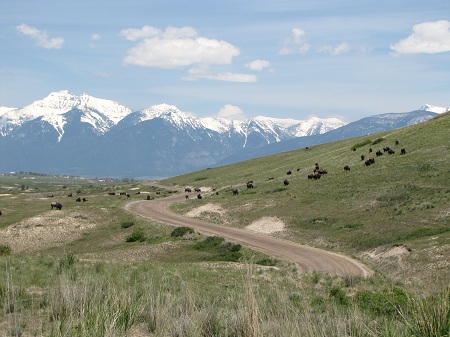 The self-guided tour of the National Bison Range. Bison visible along the road. |