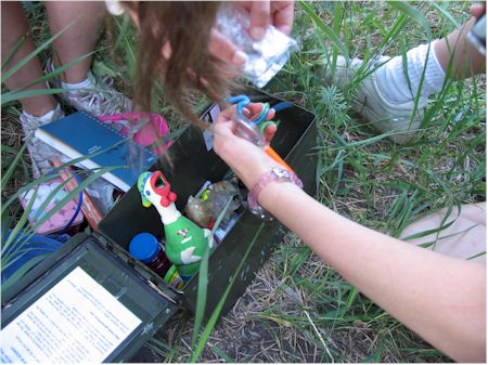 Geocaching is an outdoor activity which uses GPS, (Global Positioning System), or other navigational methods to hide and seek waterproof containers called caches. Containers are generally ammo boxes, Tupperware, or in the case of a micro cache, a film canister. Some geocache hiders get creative as in a recent cache found in our neighborhood. A 1970’s green crock pot, the same identical one that I still use to this day, contained all of the goodies. Inside the container you will find a log, in which the finder enters their geocache name, the date, and a brief message if space permits. What’s especially fun for kids is the treasure itself. Larger containers hold trinkets, toys, and other unique items for trading. Trade only for comparable items and put the cache back exactly where you find it for the next guy. Watch out for mugglers, or non-geocachers, as you don’t want to attract curiosity seekers who will disturb the cache and spoil the fun for others.