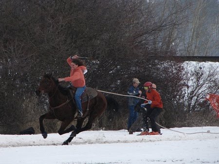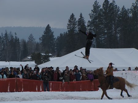 What do you get when you have a skier hang onto a rope pulled by a cowboy on a horse that’s running around a snow covered course? Skijoring of course.