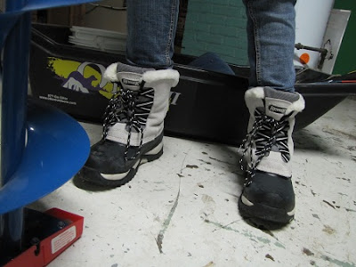 Next, we have E showing off her cushy new winter boots that are rated -50 degrees…meaning she can stand out on the ice all day to catch bad tasting fish and not get frozen feet.