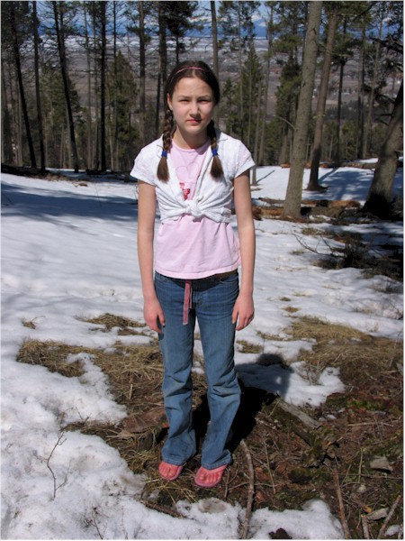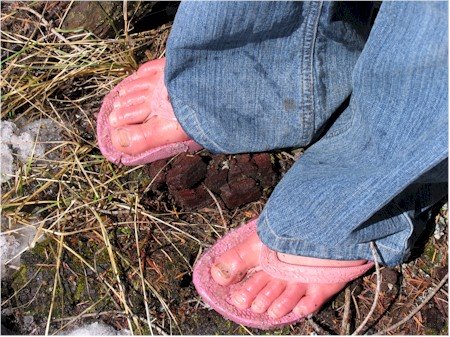After taking a turn, the snow became unavoidable, and covered the forest floor. It was more icy, than snow. M complained. Her thongs kept falling off and her feet were really starting to hurt. E was afraid M would get frostbite.