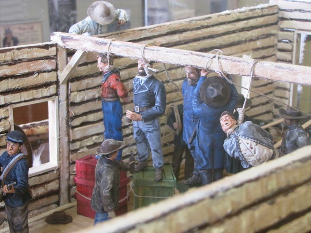 “Two men found hanging in the air” this morning up the gulch a little bit with a card on their backs on which were the words ‘Hung by the Vigilance Committee for being road agents”‘ from the Road to Virginia City – the Diary of James P. Miller.