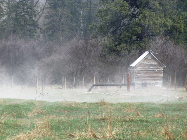 Fog surrounded a cabin near the pond. |