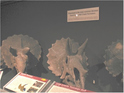 Montana is full of dinosaur bones and is also the home of one of the finest paleontology exhibits in North America. The Museum of the Rockies is located in Bozeman, and its curator is the famous paleontologist, Jack Horner. We visited the museum in May of 2006 on our way home from Yellowstone National Park. This picture of Triceratops skulls was taken in the Hall of Horns and Teeth which contains the world’s most complete Triceratops growth series.